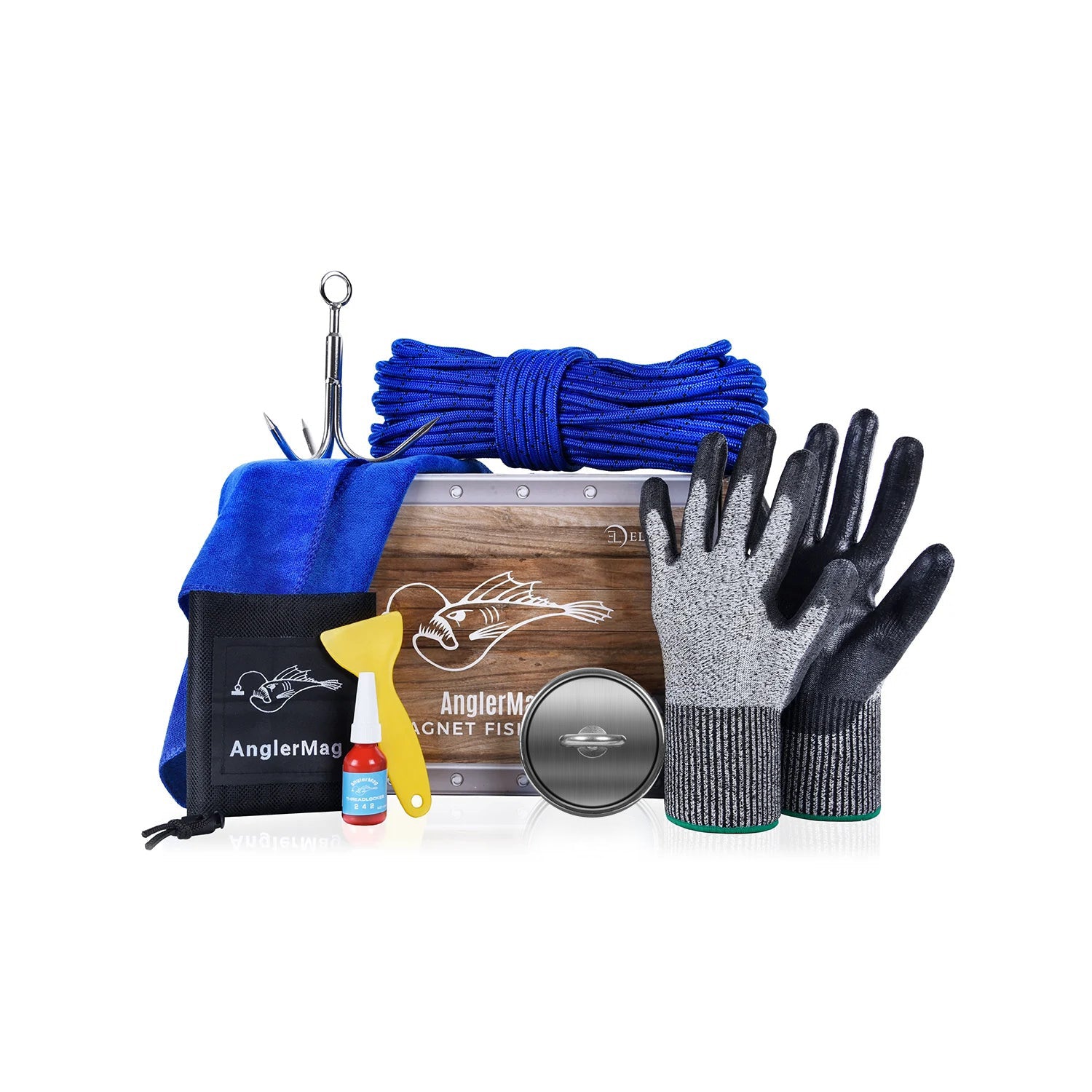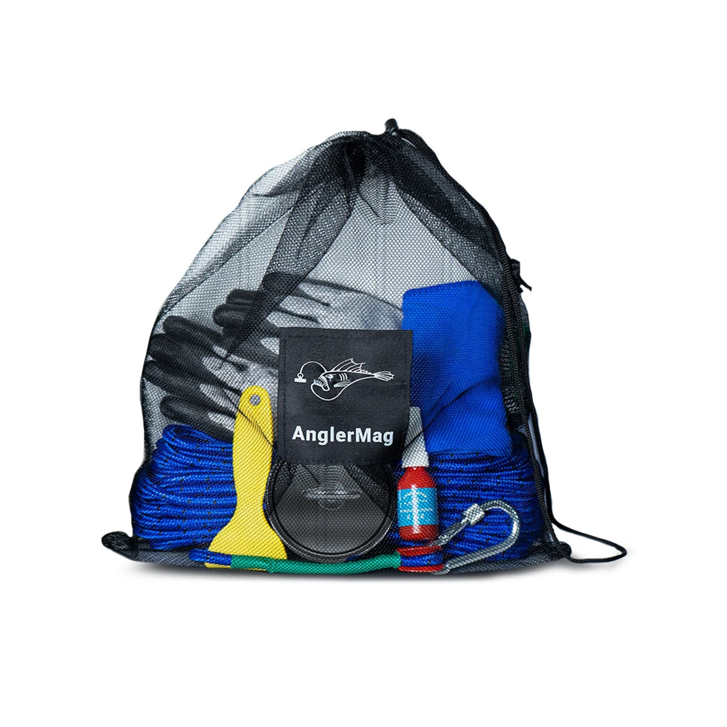 Includes (1) 1325 lb pull-force magnet, (1) 60’ magnet fishing rope, (1) 3-pronged hook, (1) carabiner, (1) bottle of threadlocker, (1) pair of tough, cut-resistant gloves, (1) plastic scraper, (1) microfiber towel, (1) mesh bag, and (1) FREE ebook.