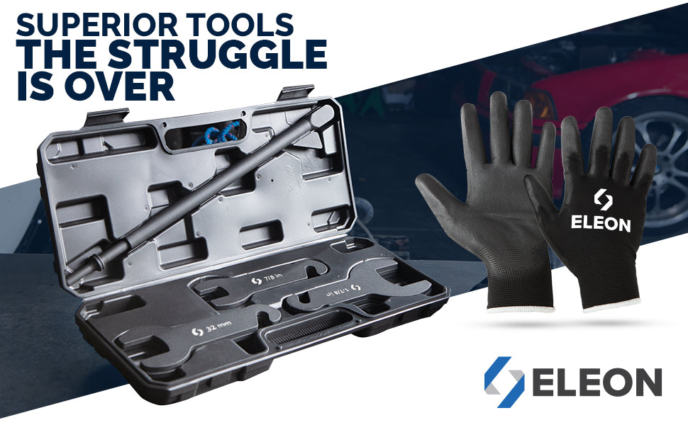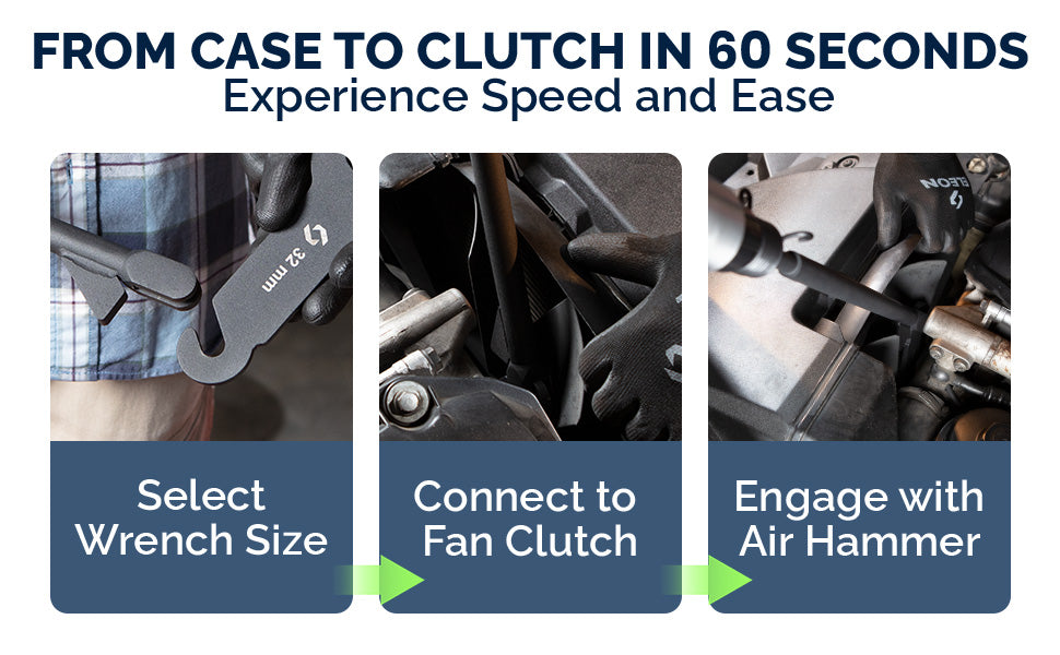 Designed to remove fan clutches with less physical effort, this pneumatic fan clutch wrench set includes work gloves to improve grip and reduce slipping during use.