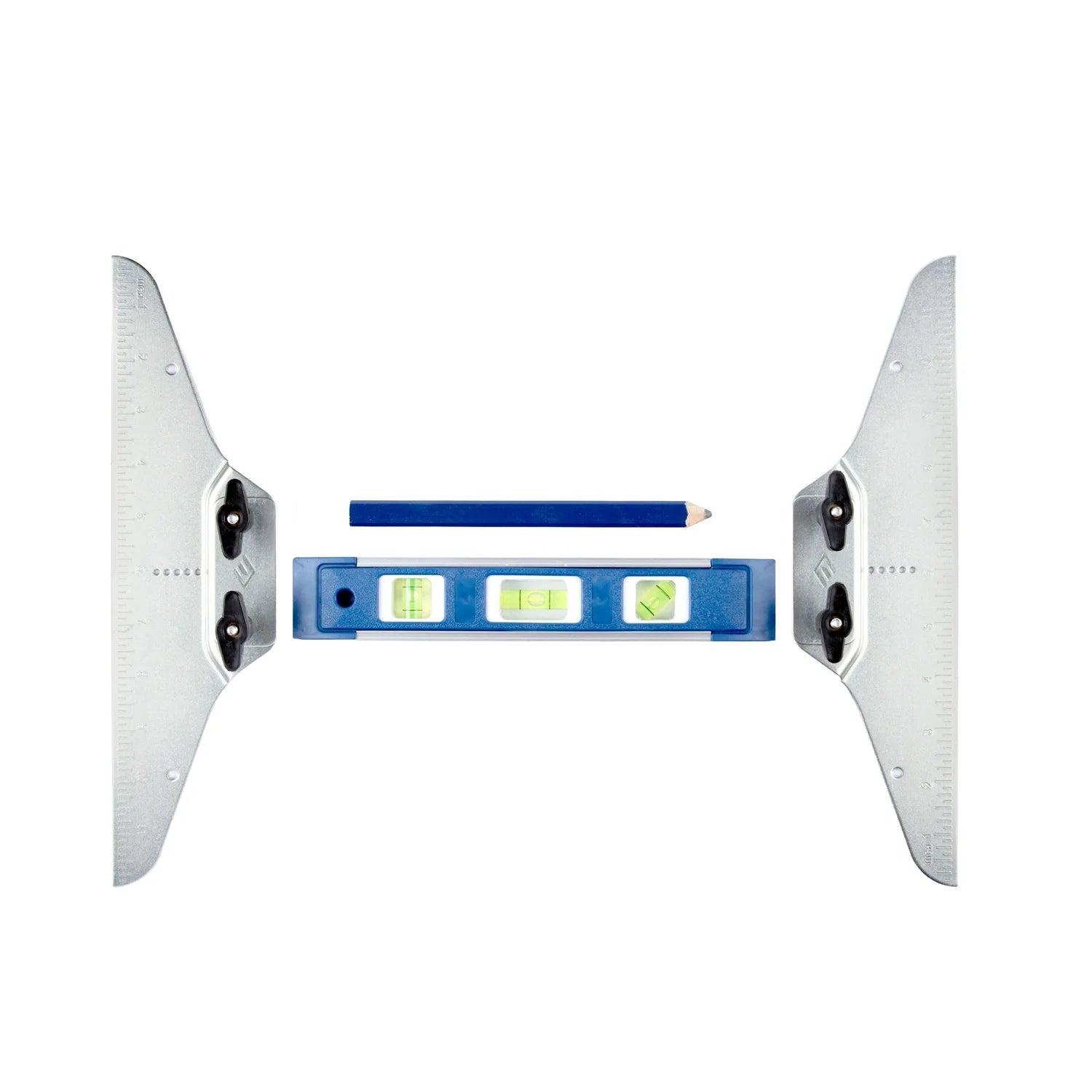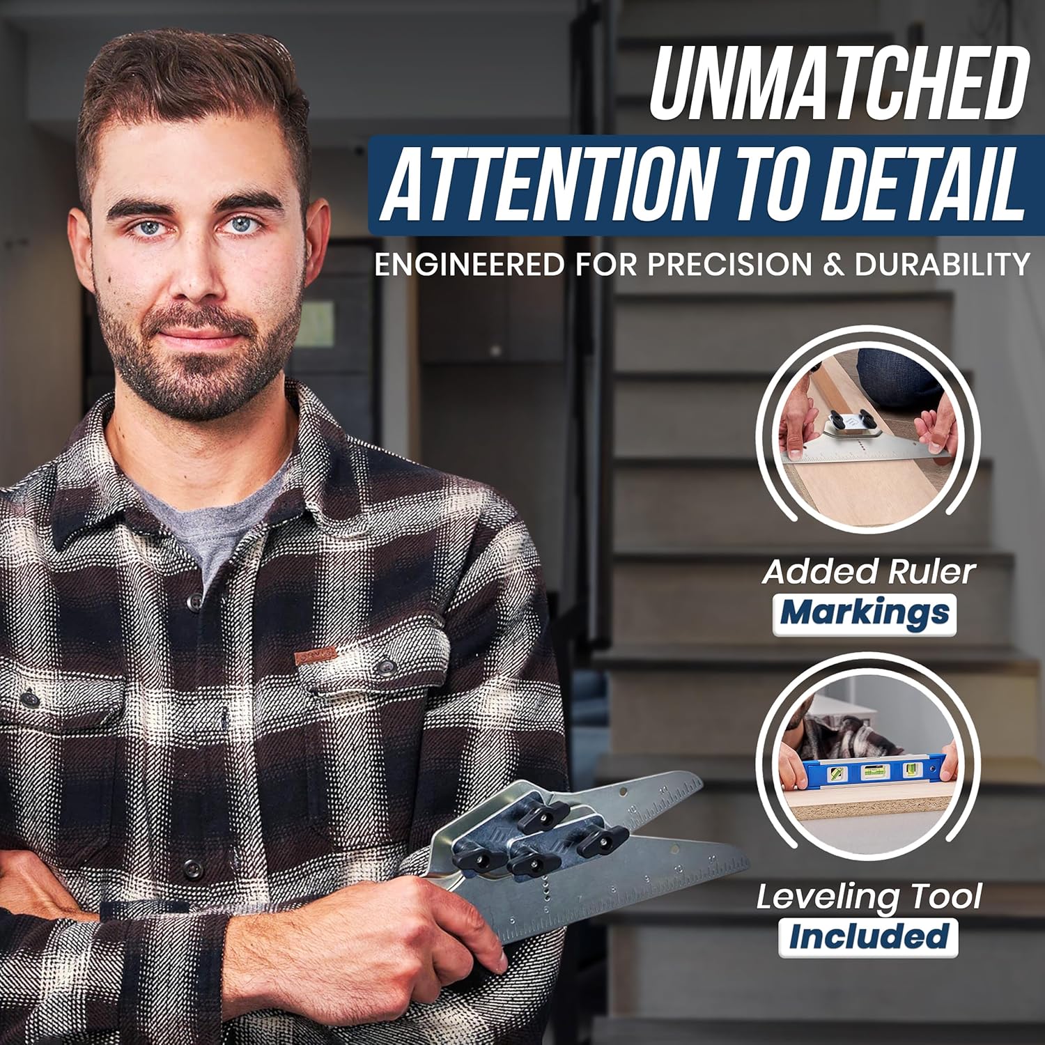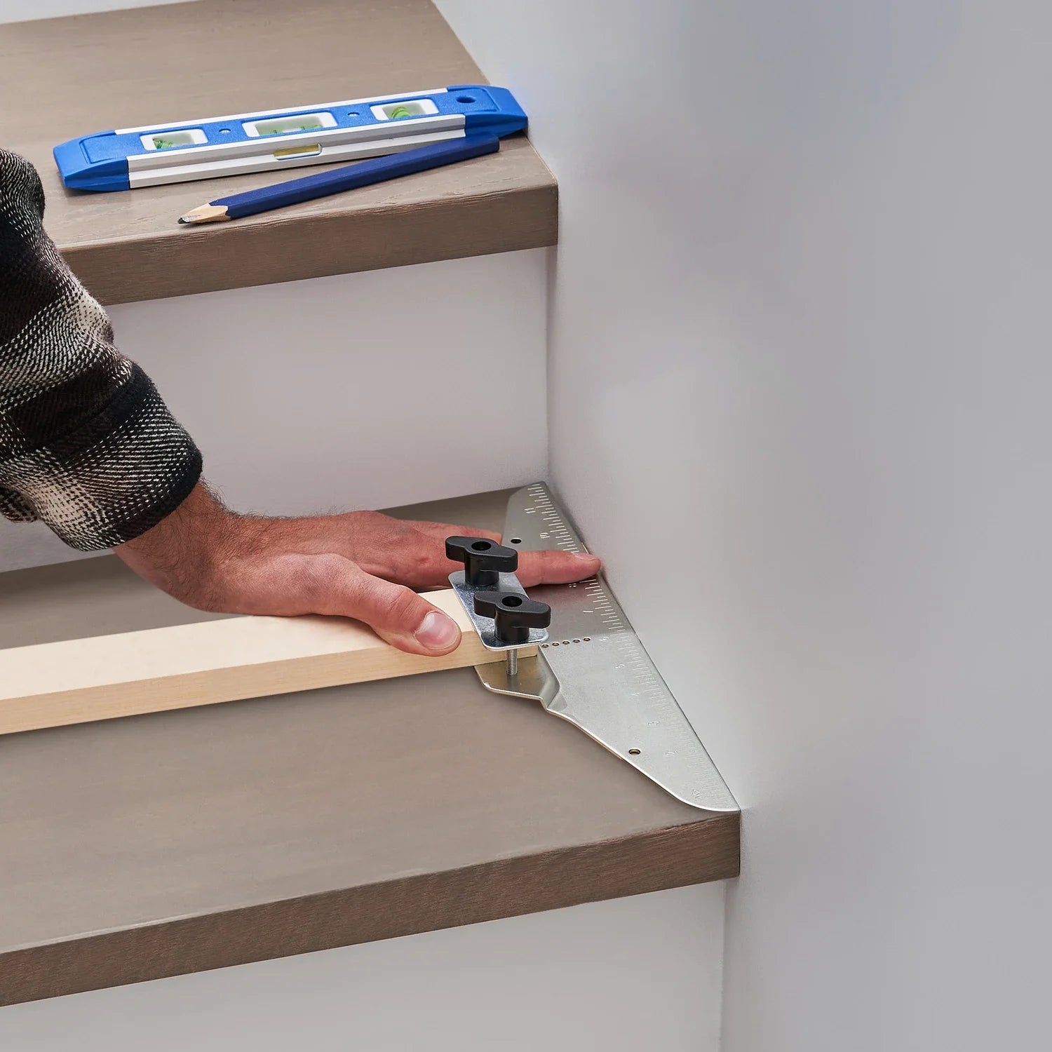 This isn't just any stair tread jig. The knobs not only firmly hold the adjustable stair gauge in place to accurately capture angles, but we've also included a carpenter pencil and level for enhanced precision.